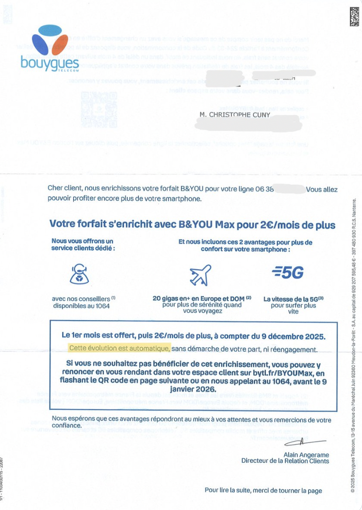 Ce message a fait réagir plusieurs abonnés, à l’image de @chcuny, qui dénonce une pratique « jouant sur l’inertie des clients pour engranger 2 € supplémentaires par mois ». Son fils, abonné à un forfait B&You 180 Go 4G à 15,99 €, a reçu cette lettre. Son forfait sera remplacé par une version 5G à 17,99 € avec plus de data à l’étranger, sauf refus explicite.