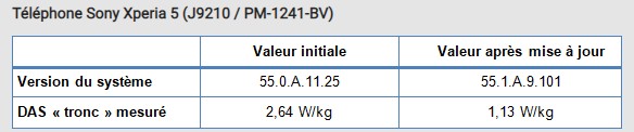 L’autorité administrative note que Sony a déployé une mise à jour permettant à la valeur du DAS tronc de passer à 1,13 W/kg et au Xperia 5 d’être désormais dans les clous.
