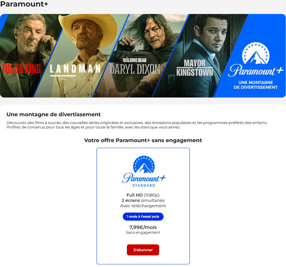 Du côté de l’offre, on retrouve la proposition classique de Paramount+ Standard, à 7.99€/mois, avec deux écrans, l’accès à la Full HD et deux écrans en simultané ainsi que la création de jusqu’à 6 profils et la possibilité de créer un profil enfant adapté aux plus petits. Le tout toujours sans engagement, et toujours avec la possibilité de regarder ses contenus en déplacement (mobile, téléviseur connecté, ordinateur…) avec un téléchargement pour un visionnage hors-ligne.