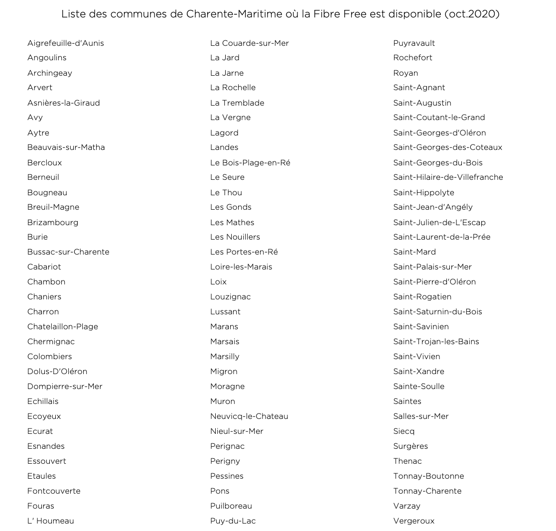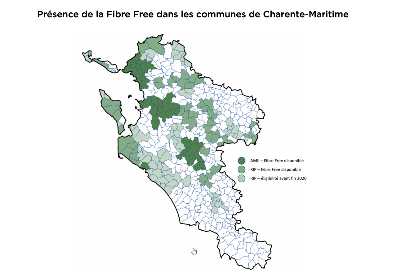 Après Somme Numérique en juillet et Orne Département THD la semaine dernière, c’est au tour du RIP Charente-Maritime THD d’accueillir officiellement les offres FTTH de Free. Si de premières Freebox sont éligibles depuis le 1er juillet, Free annonce ce matin une disponibilité pour plus de 27 000 logements répartis sur une cinquantaine de communes dont Surgères, Saint-Pierre-d’Oléron, SaintPalais-sur-Mer, Saint-Jean-d’Angély, Dolus-d’Oléron, Loix, Pons, Saint-Georges-d’Oléron, Marans, Arvert, Saint-Georges-du-Bois, Aigrefeuille-d’Aunis ou Les Mathes.