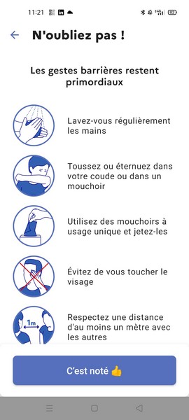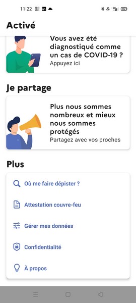 Encore plus bas, une section “Plus” permet de savoir où se faire dépister et d’obtenir une attestation couvre-feu. Des liens menant à chaque fois vers les sites gouvernementaux, depuis le navigateur Internet. Elle permet aussi de gérer ses données (suppression du téléphone et/ou du serveur) et d’avoir des informations concernant la confidentialité des données.