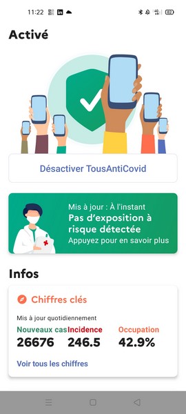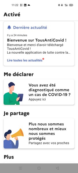 L’interface s’est enrichie de nouvelles données : risque d’exposition, chiffres clés et dernière actualité, tout cela bien en vue de l’utilisateur. Juste en dessous, et déjà proposés dans la première version, des boutons permettront de se déclarer en cas de diagnostic positif, mais également de partager l’existence de l’application avec ses proches pour favoriser son installation.