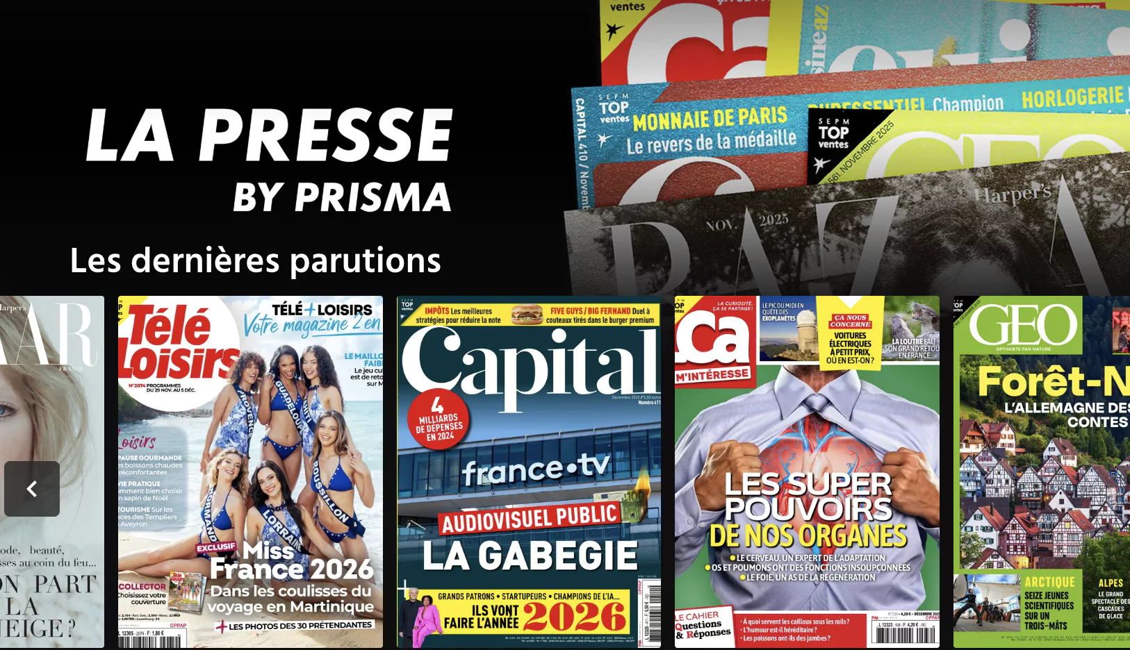 Parmi les titres déjà mis en avant, on retrouve plusieurs marques fortes de Prisma Media et de ses partenaires : Prima, Cuisine Actuelle, Télé Loisirs, Femme Actuelle, Maison Côté Sud, Maison Côté Ouest, Voici, Ideat, Harper’s Bazaar, Capital, Ça m’intéresse, GEO, Cuisine AZ, Vivre Côté Paris ou encore The Good Life. L’accès est pour l’instant proposé sans surcoût aux abonnés Canal+ via ce nouvel espace dédié.