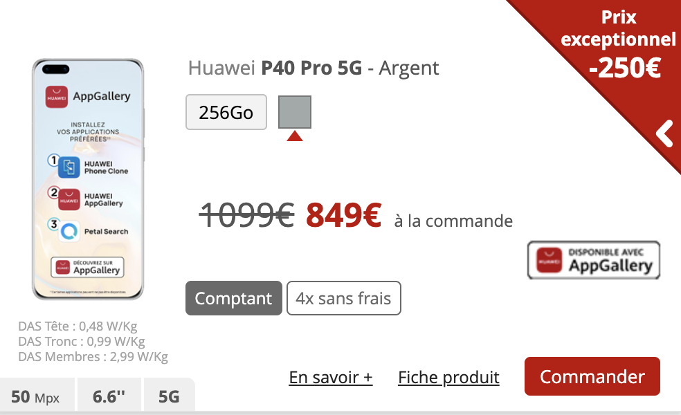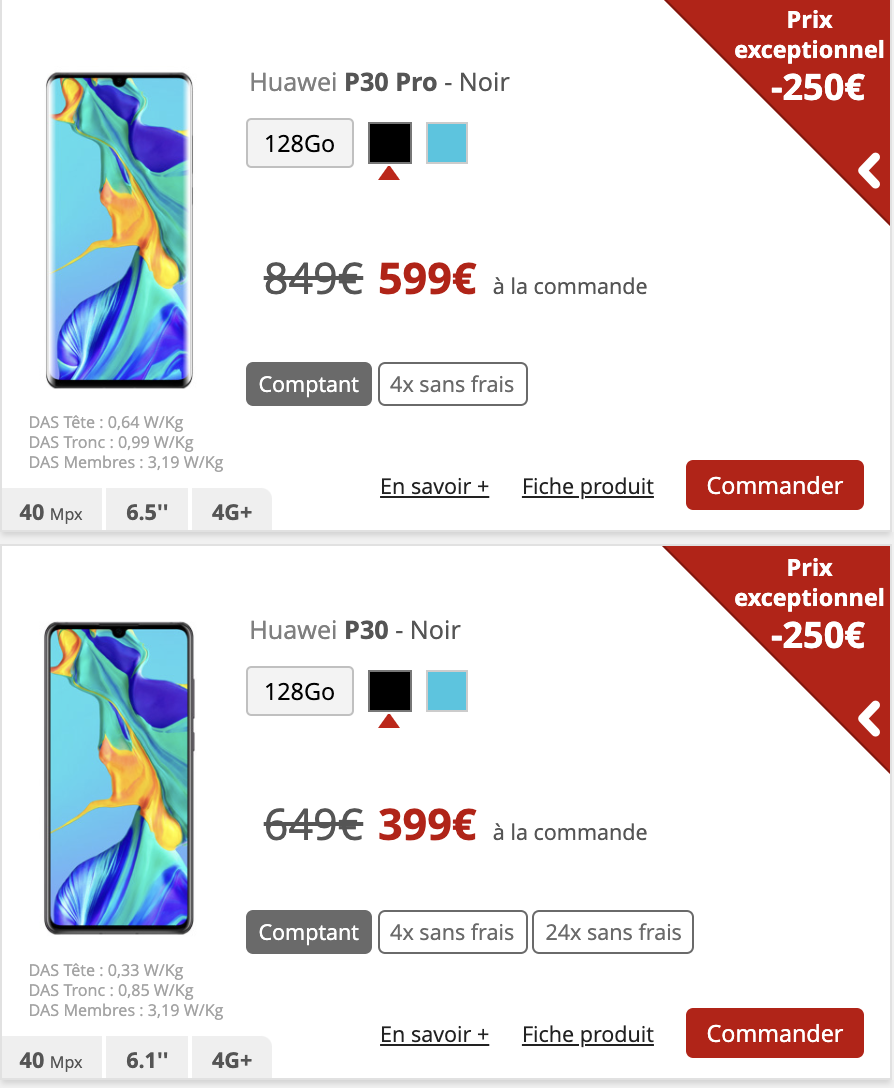 Et ce n’est pas fini, le Huawei P30 est proposé à 399€ au comptant au lieu de 649€, soit 250€ de réduction. Pour la version Huawei P30 Pro, comptez cette fois 599€ à l’achat contre 849€.