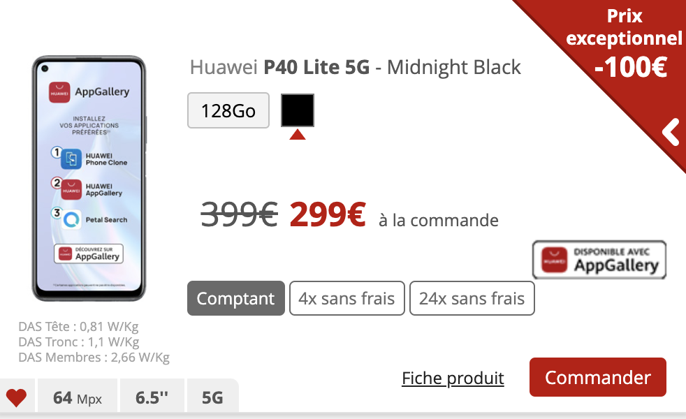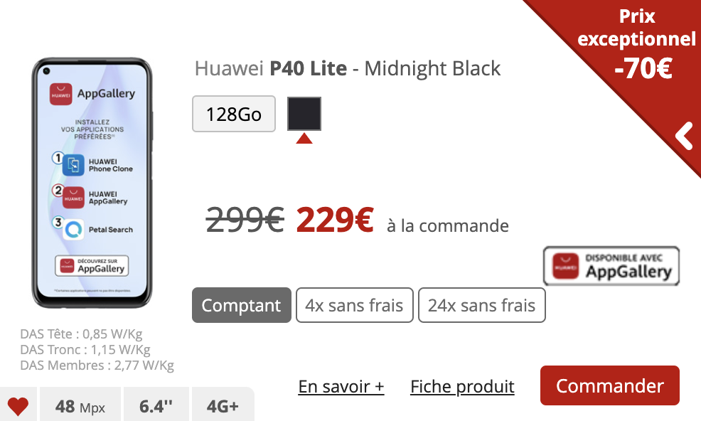 Le Huawei P40 Lite est pour sa part proposé à 229€ en achat comptant soit une baisse de 70€.