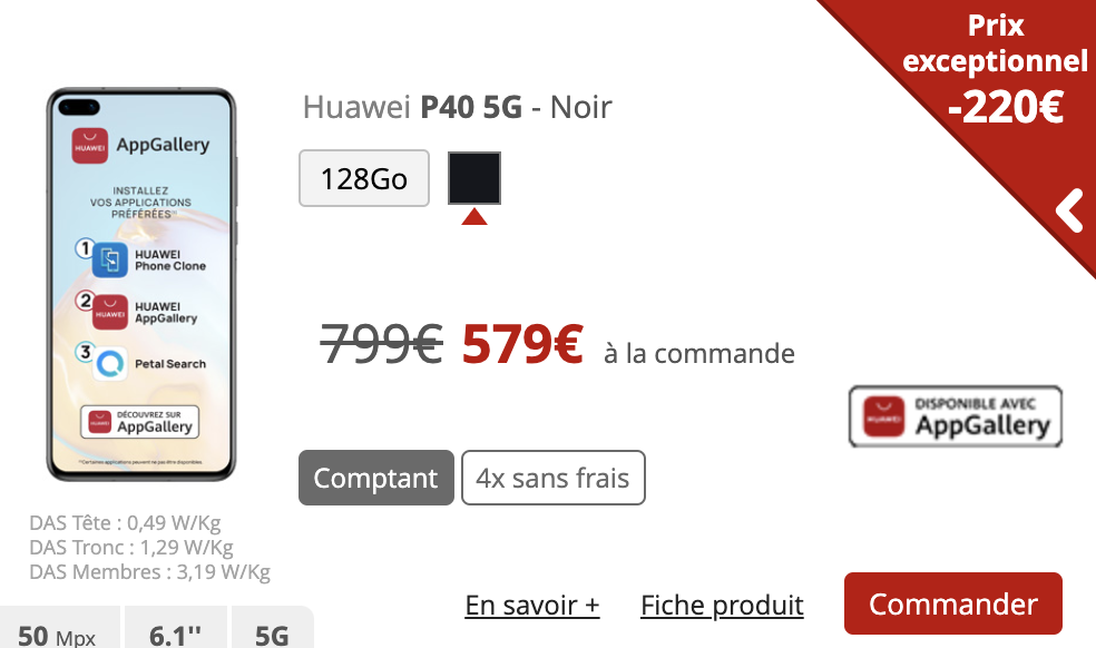 Le Huawei P40 5G quant à lui dorénavant proposé à 579€ au lieu de 799€, soit 220€ de remise contre 250€ jusqu’à présent.
