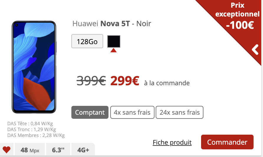 Pour le Huawei Nova 5T, une réduction de 100€ court toujours depuis juin dernier, ce smartphone est affiché à 299€ au lieu de 399€.