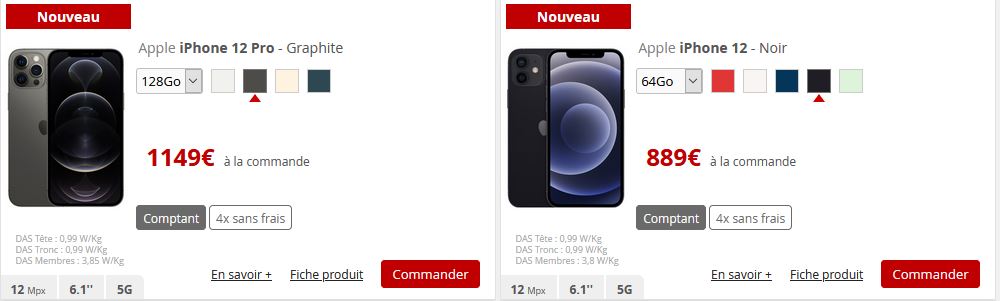 Les variantes 64, 128 et 256 Go de l’iPhone 12 s’affichent à respectivement 889, 949 et 1 069 euros au comptant. il faut compter 1 149, 1 269 et 1 499 euros pour les déclinaisons 128, 256 et 512 Go de l’iPhone 12 Pro.