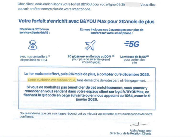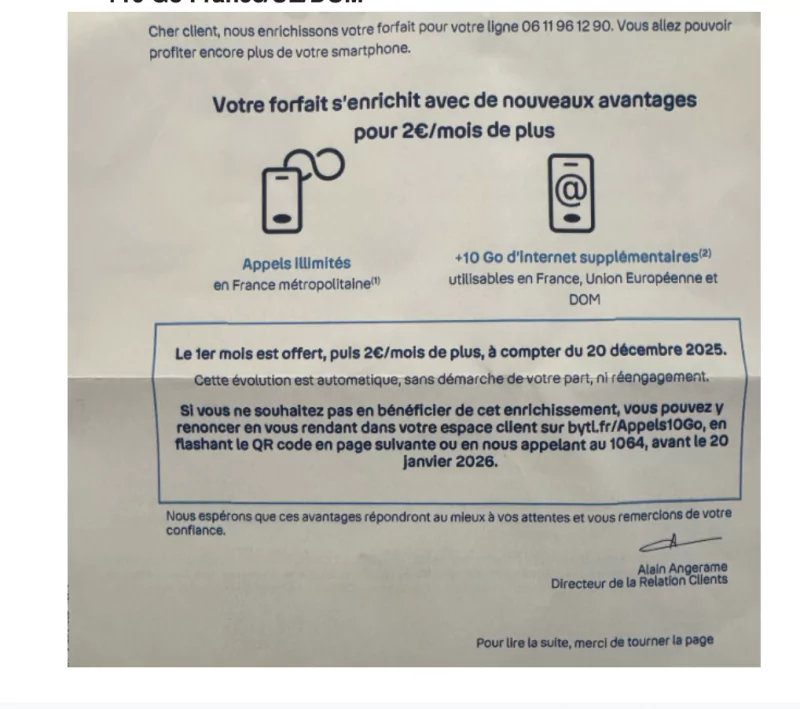 La pratique ne se limite pas aux offres sans engagement. Sur certains forfaits Bouygues Telecom plus anciens, sans appels illimités (comme des offres 2 h + 1 Go), des clients signalent également une évolution d’offre imposant +2 €/mois avec premier mois offert. Ici aussi, l’opérateur met en avant de nouveaux avantages comme les appels illimités en France métropolitaine et 10 Go supplémentaires utilisables en France, en Europe et dans les DOM. Là encore, la modification est présentée comme automatique, mais refusable via l’espace client, un QR code imprimé sur le courrier ou un appel au service client, dans un délai d’environ un mois. Si ces hausses restent légalement optionnelles, elles reposent sur un mécanisme de consentement tacite : sans action de leur part, les abonnés voient leur facture augmenter.