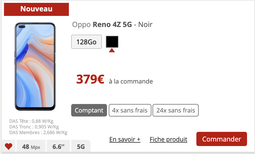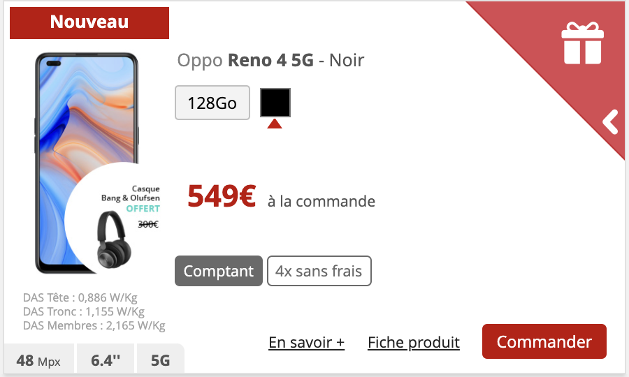 Disponible en précommande depuis le 9 octobre dernier, le nouveau Oppo Reno 4 5G est désormais disponible à la commande. Il faudra débourser 549 euros en achat comptant. Disponibilité en quatre fois sans frais (138 euros à la commande, puis 3x fois 137 euros). Un casque Bang & Olufsen d’une valeur de 300 euros est offert pour tout achat.