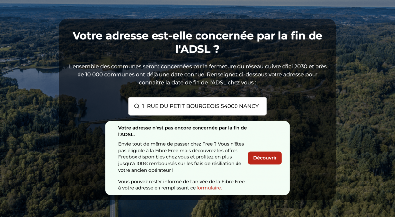 Passé inaperçu, Free a mis en ligne une page destinée aux abonnés encore connectés en ADSL, centrée sur un outil inédit : un simulateur permettant de connaître la date prévue d’extinction du cuivre à une adresse donnée. Près de 10 000 communes disposent déjà d’une échéance officielle, dans le cadre du vaste chantier de fermeture du réseau cuivre d’ici 2030.