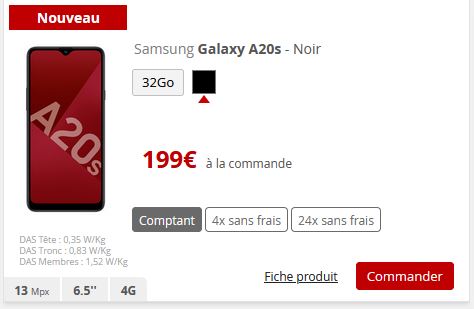 Ainsi, le Samsung Galaxy A20s est disponible dans son coloris noir avec 32 Go de stockage. A la commande, il revient à 199€, mais vous pouvez aussi échelonner le paiement en plusieurs fois. Si vous choisissez la solution 4x sans frais, vous réglerez 52€ à la commande, puis trois fois 49€ sans frais. Mais vous pouvez prolonger la durée de paiement, en payant 31€ puis 24 fois 7€ sans frais.