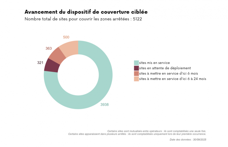 À fin septembre 2025, 5 122 zones ont été listées par arrêtés successifs depuis 2018. Dans le détail, 4 860 zones concernent Bouygues Telecom, 4 902 Free Mobile, 4 869 Orange et 4 866 SFR, certains sites étant communs à plusieurs opérateurs.  Selon l’Arcep, les opérateurs ont mis en service 3 938 zones en 4G dans le cadre du dispositif de couverture ciblée. La présence par opérateur est relativement homogène, Bouygues Telecom est présent sur 3 706 sites, Free Mobile sur 3 741 sites, Orange sur 3 736 sites, et SFR sur 3 712 sites.