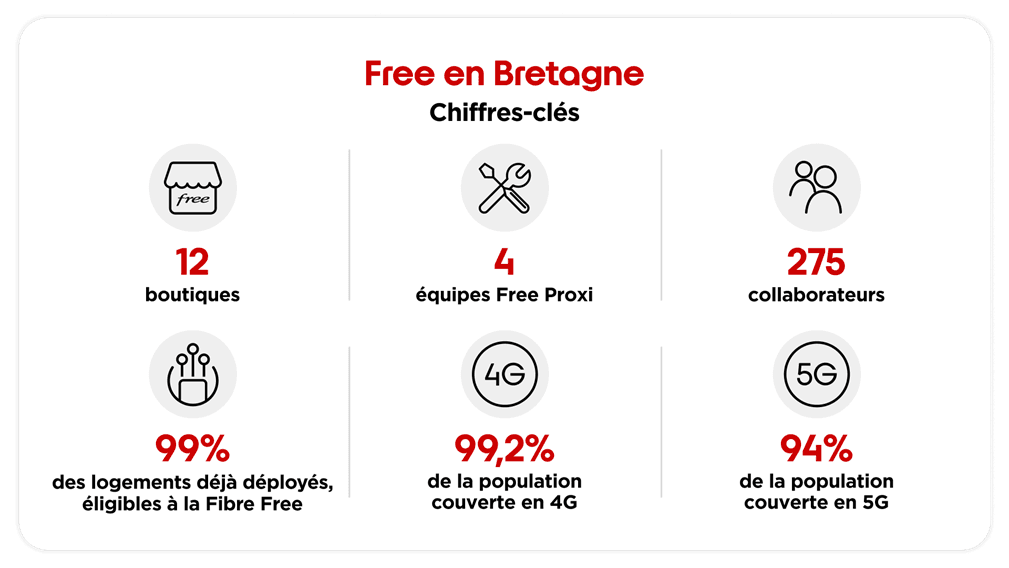 “En Bretagne, comme partout en France, Free a par ailleurs déployé son propre réseau mobile en s’appuyant sur des équipements dernière génération qui lui permettent de couvrir aujourd’hui plus de 99% de la population en 4G et 94 % en 5G”, précise l’opérateur.