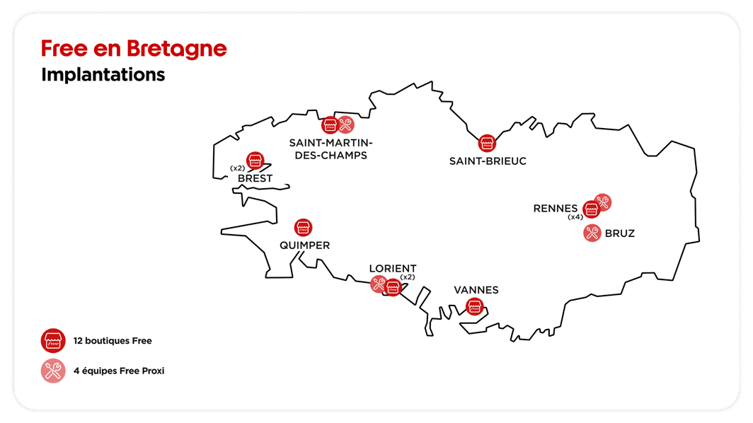 Dans la région, l’opérateur est par ailleurs présent dans toutes les zones denses et moyennement denses, également sur le RIP Rev@ (Vannes Agglomération). Le réseau de distribution de Free est aussi implanté dans les quatre départements de Bretagne grâce à 12 boutiques et 4 équipes Free Proxi, le service d’assistance de proximité de Free. L’opérateur emploie 275 collaborateurs dans la région.