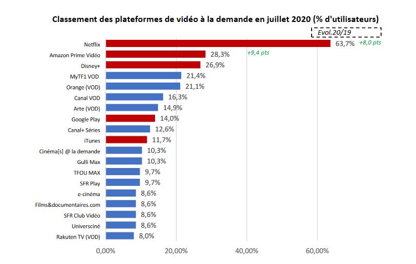 Sans surprise, Netflix est le service SVOD le plus regardé en France puisque 63.7% des consommateurs de la SVOD ont utilisé cette plateforme. Elle est suivie d’Amazon Prime Video ( qui enregistre une augmentation de 9.4 points par rapport à l’année dernière) et de Disney+, qui s’était déjà installé sur la troisième marche du podium lors de son arrivée en avril.