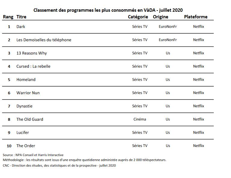 Côté programmes, c’est Netflix qui occupe toutes les places des contenus les plus regardés en vidéo à la demande, avec 9 séries et 1 film. A noter cependant que les deux séries les plus vues en juillet 2020 sont des productions européennes.