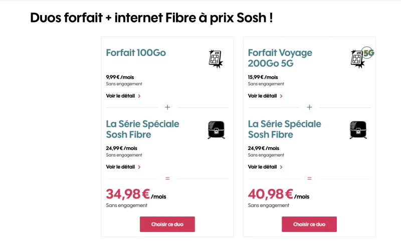 Sur son site, l’opérateur met en avant ces duos comme une manière simple de composer son équipement télécom du quotidien : un forfait mobile + la fibre optique “à prix Sosh”. Le principe est clair : Sosh affiche un montant mensuel global correspondant exactement à la somme des deux abonnements choisis, sans avantage additionnel lié au couplage. Une logique très proche des offres Open d’Orange, mais sans remise multi-services.