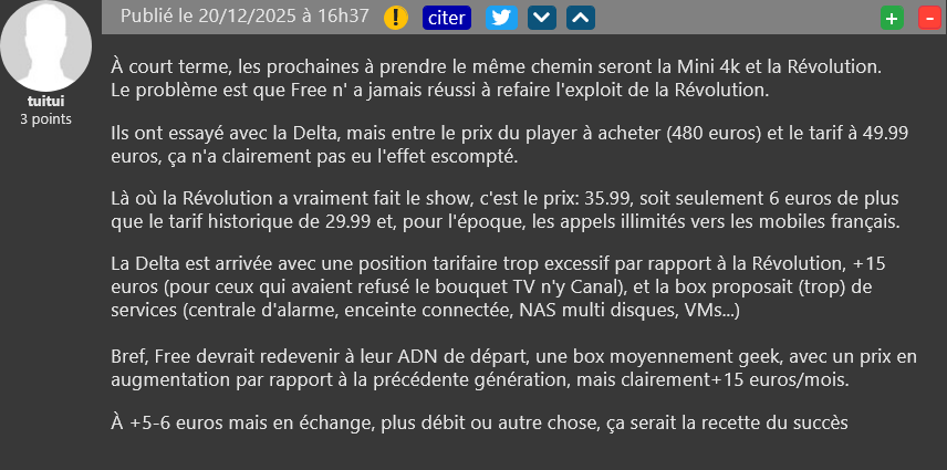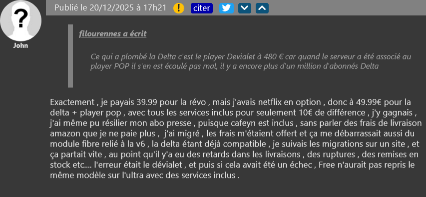 Free a enclenché le compte à rebours il y a de nombreux mois : les Freebox Crystal (V5) et Freebox One ne devraient plus fonctionner après le 31 décembre 2025. Les abonnés concernés ont vu des propositions de migration apparaître dans leur Espace Abonné, avec frais de migration offerts et, selon les cas, des tarifs promotionnels la première année. Évidemment, difficile d’évoquer la One sans penser à sa grande soeur, lancée en même temps : la Freebox Delta. Décidémment, même après l’arrêt de sa commercialisation, la box lancée en 2018 continue de fait parler d’elle…
