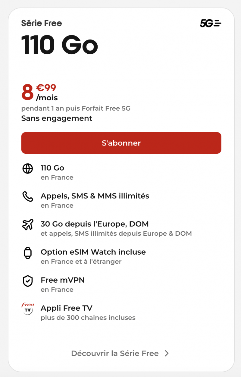Malgré cette baisse de la data incluse, la Série Free conserve l’ensemble de ses avantages, appels, SMS et MMS illimités en France, 30 Go utilisables depuis l’Europe et les DOM, option eSIM Watch incluse, accès à Free mVPN, et Free TV+, avec plus de 300 chaînes accessibles sur de nombreux supports.