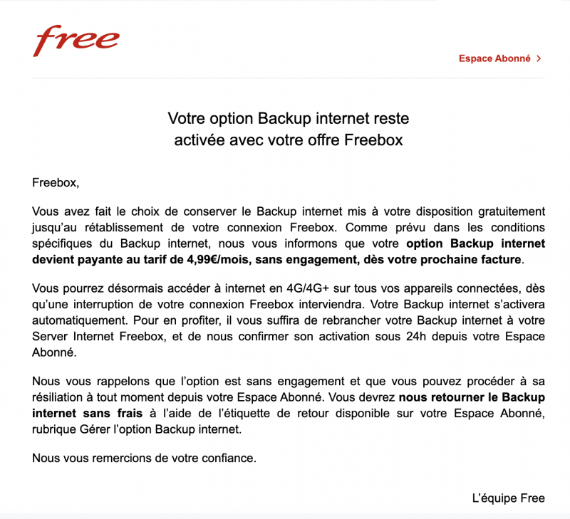 Point important : le Backup n’est pas apparu du jour au lendemain. Il était déjà disponible via l’assistance depuis fin 2023 mais Free l’a ensuite ouvert à la souscription directe : à l’été 2024, le Backup Internet Freebox est depuis devenu disponible en option dans l’Espace Abonné. Cette option est facturée 4,99 €/mois, sans engagement, et concerne tous les abonnés Freebox Ultra et Ultra Essentiel. Si le FAI avait annoncé en 2024 une disponibilité “très prochainement “pour les abonnés Freebox Pop, Delta, Révolution, mini 4K et One, un retard est donc a noter.