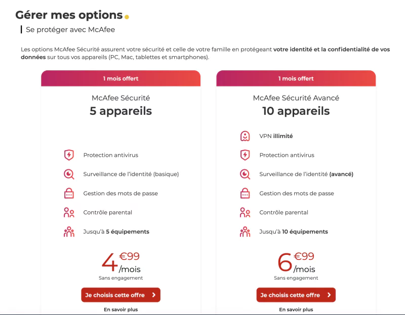 Deux formules sont proposées. La première, McAfee Sécurité, permet de protéger jusqu’à cinq appareils. Elle inclut une protection antivirus, une gestion des mots de passe, un contrôle parental ainsi qu’une surveillance basique de l’identité. La seconde, McAfee Sécurité Avancé, étend la couverture à dix appareils et ajoute des fonctionnalités plus poussées, comme un VPN illimité (Free Mobile propose le sien gratuitement) et une surveillance avancée de l’identité, pensée pour détecter plus efficacement les fuites de données personnelles.