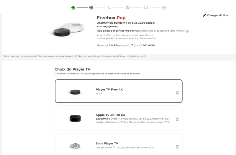 Enfin, une troisième option existe : ne pas prendre de player TV. Ce choix donne droit à 10 € de remise sur la première facture, une solution pensée pour les abonnés déjà équipés ou qui privilégient exclusivement les applications TV via Smart TV, Apple TV ou Android TV mais qui désirent absolument l’option TV.