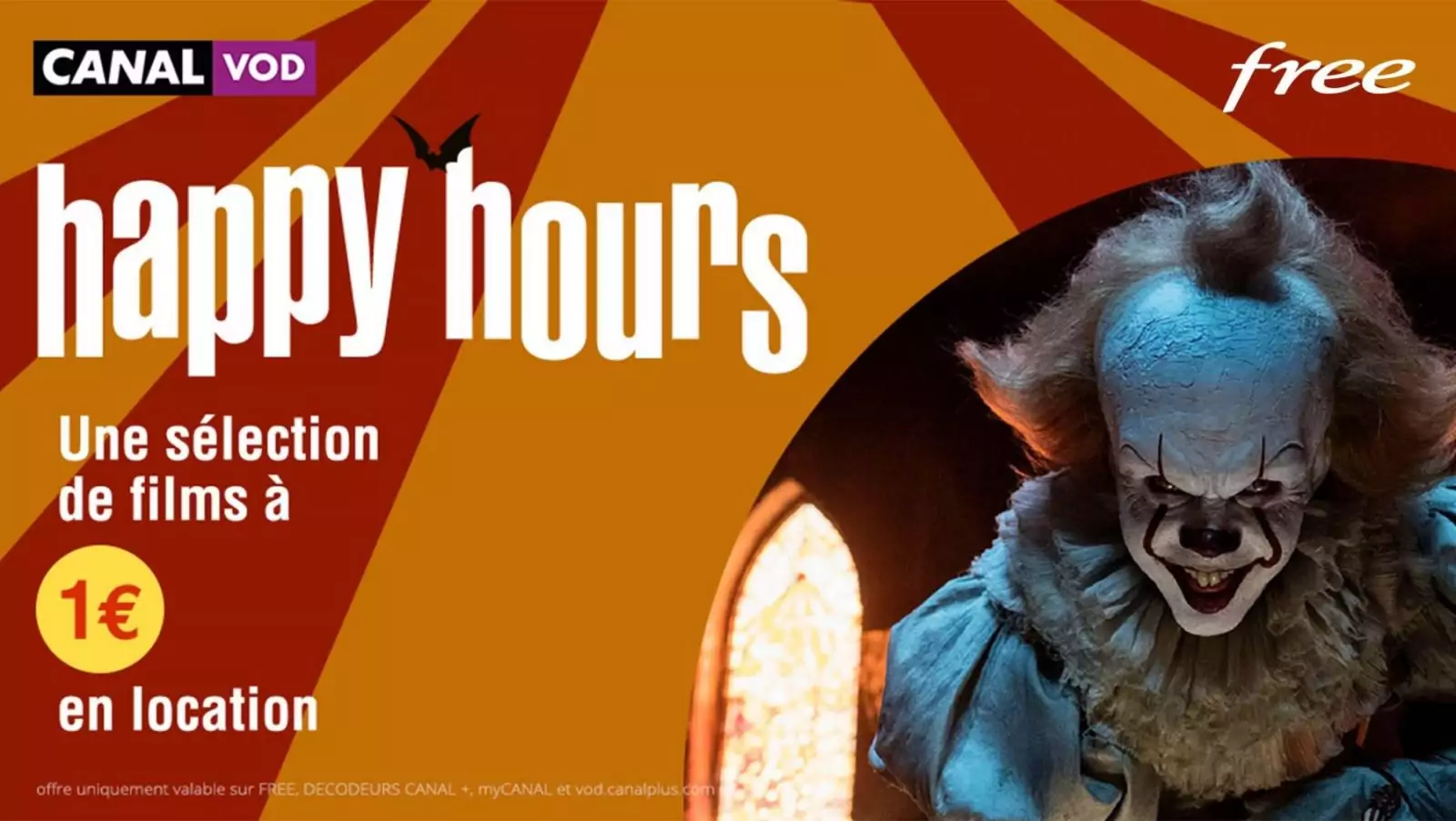 “Les Happy Hours sont de retour pour une édition spéciale Halloween : rendez-vous ce vendredi 30 octobre pour découvrir une sélection de films qui vous fera trembler… pour seulement 1€ la location”, annonce ce matin Free à ses abonnés Freebox. Pour en profiter, rendez-vous dès maintenant et ce jusqu’à 00h01 sur Canal VOD dans la rubrique « Vidéo-Club » de Freebox TV. Munissez-vous de votre code d’achat pour finaliser la commande.