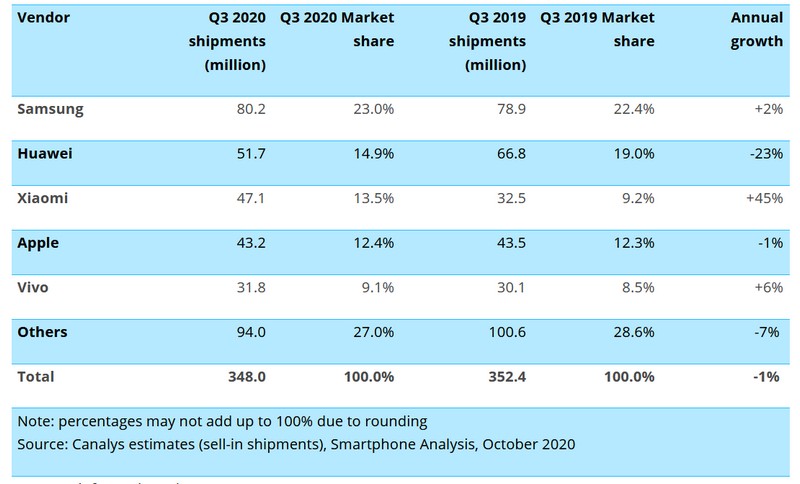 Les chiffres de Canalys indiquent un marché du smartphone en légère baisse par rapport à l’année dernière. Au cours du troisième trimestre 2020, il s’est vendu 348 millions de smartphones, contre 352,4 millions à la même période en 2019. Soit un recul de 1 %.