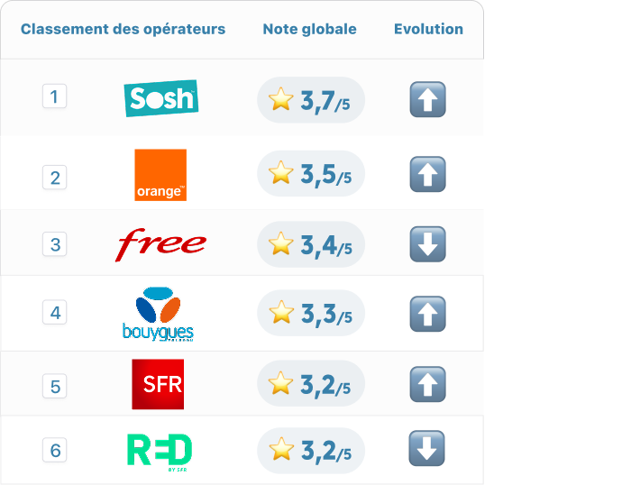 Sur le segment fixe, Sosh arrive en tête avec une note globale de 3,7 sur 5, devant Orange (3,5) et Free (3,4). Bouygues Telecom suit de près avec 3,3, tandis que SFR ferme la marche avec 3,2.