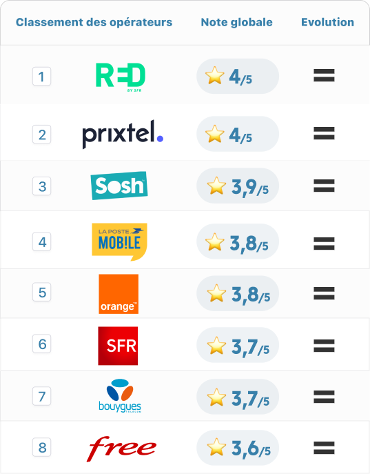 Côté mobile, le classement reste inchangé un an plus tard. Les marques low-cost continuent de dominer la satisfaction, avec RED et Prixtel en tête, tous deux notés 4 sur 5. Sosh suit avec 3,9, devant La Poste Mobile (3,8) puis Orange (3,8). Les opérateurs “classiques” ferment la marche, avec SFR et Bouygues à 3,7, et Free dernier à 3,6. Là encore, les écarts sont faibles, mais la hiérarchie reste stable.
