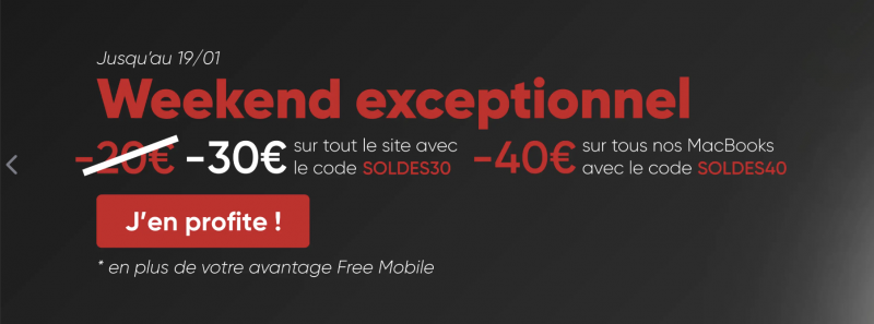 CertiDeal, partenaire de Free Mobile pour la vente de smartphones reconditionnés, muscle ses promotions en pleine période de soldes. Les abonnés de l’opérateur ont récemment reçu un courriel les invitant à profiter d’une remise immédiate de 20 € sur l’ensemble du site du spécialiste français du reconditionnement, cumulable avec l’avantage exclusif de –5 % réservé aux clients Free Mobile. Mais ce n’est pas tout : jusqu’au 19 janvier, CertiDeal va plus loin avec un week-end promotionnel exceptionnel, proposant des remises encore plus élevées que celles initialement annoncées.