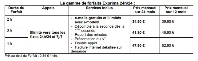 Le 19 janvier 2007 Bouygues Telecom lançait son offre mobile Exprima, un forfait mobile qui permettait les appels illimités 24h/24 et 7j/7 vers les fixes de France métropolitaine. Cela fait suite à son forfait Neo qui lui permettait les appels illimités vers mobiles et fixes en semaine à partir de 20h. Une nouvelle gamme de forfaits donc, avec des variantes selon la durée d’appel autorisée.