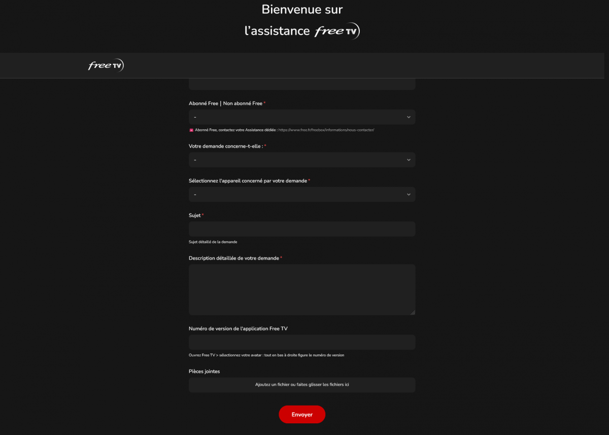 En effet, depuis peu, la page d’accueil a été complètement revue pour devenir une page dédiée à prendre contact directement avec l’assistance de l’opérateur concernant le service Free TV. Un formulaire classique permettant de saisir sa problématique, son nom, son adresse mail, et même de joindre des images de votre problème rencontré.