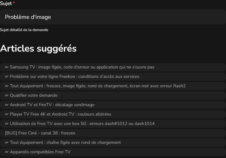 Cependant, outre le fait que les suggestions peuvent être incomplètes ou ne pas parfaitement convenir à une problématique, il ne s’agit pas forcément d’une méthode très intuitive pour retrouver des informations. On peut en effet, en voyant un formulaire à remplir, très vite se décourager alors que l’on cherchait un bug bien précis, ou une compatibilité spécifique avec un type d’appareil, ou toute autre information qui n’est pas présente sur le site d’Assistance Free classique. Si l’abonné sait déjà ce qu’il cherche, aura-t-il véritablement envie de remplir un formulaire de contact pour finalement s’apercevoir que l’article est déjà présent ?
