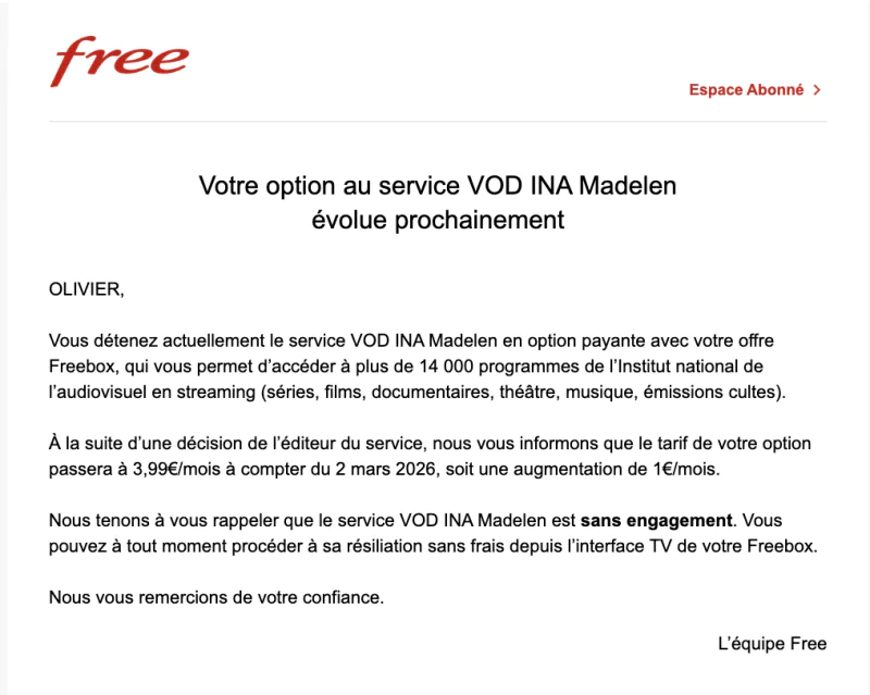 Lancée en juin 2025 sur les Freebox, la plateforme de streaming Madelen créée par l’institut national de l’audiovisuel, INA), va appliquer une hausse tarifaire sur son abonnement. Dans l’optique de prévenir les abonnés Freebox concernés, Free envoi actuellement un mail : “Vous détenez actuellement le service VOD INA Madelen en option payante avec votre offre Freebox, qui vous permet d’accéder à plus de 14 000 programmes de l’Institut national de l’audiovisuel en streaming (séries, films, documentaires, théâtre, musique, émissions cultes). À la suite d’une décision de l’éditeur du service, nous vous informons que le tarif de votre option passera à 3,99€/mois à compter du 2 mars 2026, soit une augmentation de 1€/mois”, prévient-il et de rappeler que ce service VOD est sans engagement, il est donc possible de résilier à tout moment depuis l’interface TV de la Freebox.