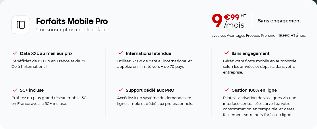 Free Pro fait également évoluer son enveloppe de data à l’étranger. Le volume de données incluses passe de 31 Go à 37 Go, offrant davantage de confort aux professionnels amenés à se déplacer hors de France. En parallèle, le tarif de la data hors enveloppe est revu à la baisse, passant de 0,0013 euro par Mo à 0,0011 euro par Mo, ce qui réduit le coût des usages ponctuels supplémentaires.