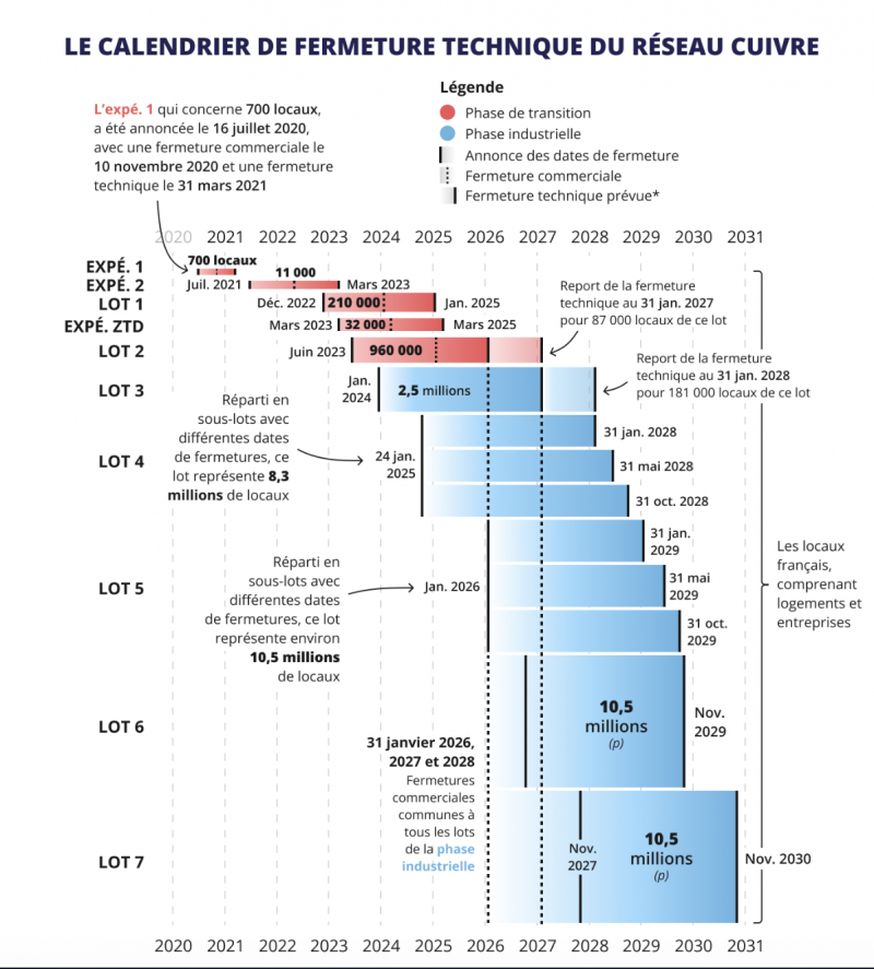 Le plan de fermeture du cuivre n’est pas improvisé. Il a été mis en consultation par l’Arcep dès 2022, avant une validation définitive à l’été de la même année. Le lot 2 a été officiellement lancé en juin 2023, suivi d’une première vague de fermetures techniques début 2025 dans 162 communes. Le calendrier s’accélère désormais avec comme prochaine étape prévue le 31 janvier 2027, avec la fermeture technique du réseau cuivre pour près de 2,5 millions de locaux. Pour les habitants et professionnels concernés, Orange met à disposition une carte interactive permettant de vérifier l’état d’avancement de la modernisation réseau sur chaque territoire. Pour mieux comprendre le calendrier de fermeture commerciale et technique d’Orange, l’Arcep a mis en ligne un graphique explicatif intégrant également les nouveaux reports.