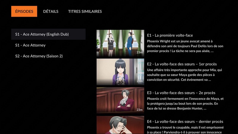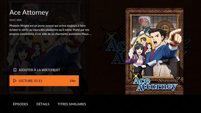 Les fiches des contenus sont complètes, tout en restant claires. Dans la partie supérieure, on trouve un bouton pour alimenter une Watch List (accessible depuis le menu principal de l’application) et le bouton pour lancer le contenu.