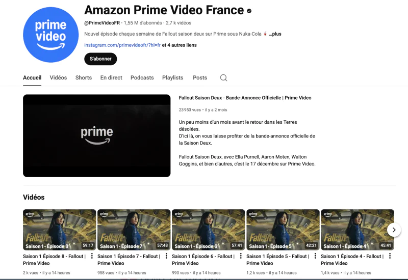 Toute la saison 1 de Fallout est disponible gratuitement sur YouTube. Un joli appât pour attirer les utilisateurs vers Prime Video qui diffuse actuellement la saison 2.Amazon Prime Video rend gratuitement accessible l’intégralité de la saison 1 de Fallout sur sa chaîne YouTube officielle en France. Les huit épisodes de la série sont donc proposés sans abonnement, pour une durée limitée.