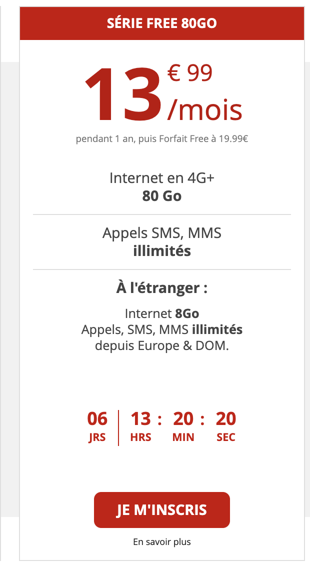 Au-delà de la première année, les abonnés basculeront automatiquement sur le Forfait Free avec enveloppe data de 100 Go à 19,99 euros par mois ou avec data illimitée à 15,99 euros par mois pour les abonnés Freebox, voire 9,99€/mois pour les abonnés Freebox Pop.