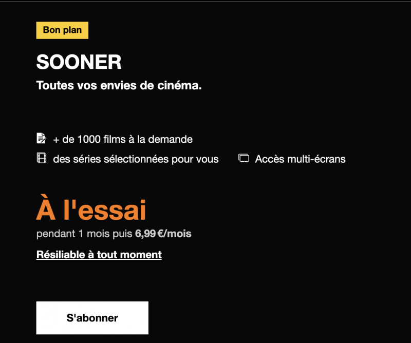 Sur le site d’Orange, l’offre Sooner est présentée comme un « bon plan » : plus de 1 000 films à la demande, des séries sélectionnées et un accès multi‑écrans. Le service est « à l’essai pendant un mois, puis 6,99 €/mois ». Un catalogue enrichi et une interface repensée offriront plus de 15 000 oeuvres contemporaines et patrimoniales à l’achat ou à la location ainsi que plus de 1 300 titres en SVOD. Ce qui ne changera pas pour les abonnés existants à Univers Ciné ou Filmo concerne leurs comptes, favoris et contenus achetés lesquels seront automatiquement transférés, et il suffira de saisir son adresse e‑mail pour activer Sooner.