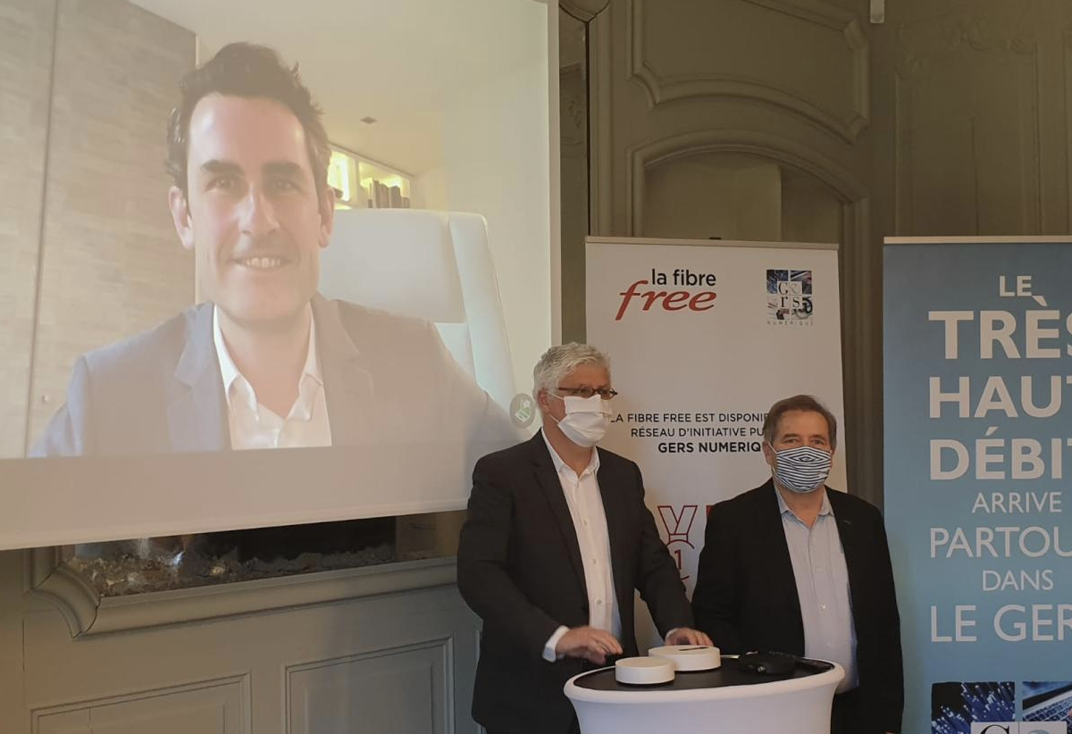 Philippe Martin (Président du Département du Gers), Jean-Pierre Salers (Président de Gers Numérique) et Thomas Reynaud (Directeur Général d’Iliad-Free).