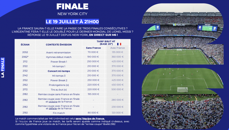 Derrière cet engagement, un enjeu financier majeur. Les offres commerciales dévoilées par M6 Unlimited montrent des tarifs publicitaires records, en particulier pour la finale du 19 juillet à New York. Pour un spot de 20 secondes, les prix varient de 70 000 € avant-match sans la France à 135 000 € avec les Bleus. Pendant la rencontre, les coupures premium, notamment lors des pauses fraîcheur, sont facturées jusqu’à 425 000 € si l’équipe de France est en finale, contre 250 000 € sans elle.