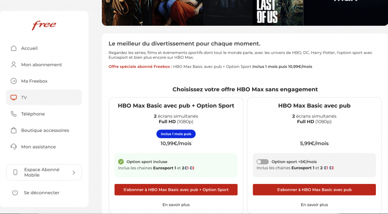 Des abonnés Freebox Ultra et Révolution (a minima) profitent aujourd’hui d’une nouvelle offre HBO Max Basic avec pub+ Eurosport 1 et 2 offerts pendant 1 mois.
