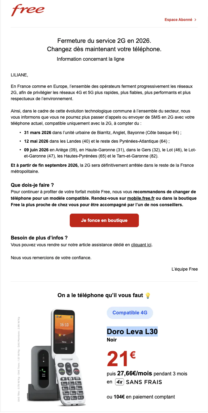 Dans une nouvelle campagne d’information déployée à travers un courriel envoyé à certains de ses abonnés, Free Mobile alerte de la fermeture progressive du réseau 2G d’Orange à partir de fin mars 2026. L’opérateur y détaille le calendrier de cette extinction et les solutions proposées pour continuer à utiliser son forfait mobile.