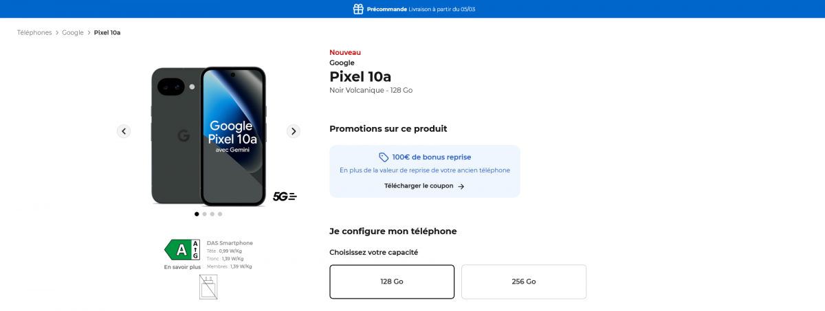 Récemment présenté par Google, le Pixel 10a est disponible à la précommande sur le site de Free Mobile, avec une livraison prévue pour le 5 mars prochain. Cette nouvelle proposition de smartphone milieu de gamme avec un accent important mis sur la durée de vie et sur l’autonomie est disponible en quatre coloris : noir volcanique, rouge framboise, lavande et brume, avec un bonus reprise de 100€.
