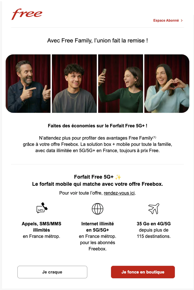 Le message est clair : « Avec Free Family, l’union fait la remise ! ». Free rappelle que les abonnés Freebox peuvent profiter immédiatement d’une remise significative sur son forfait mobile phare, conçu pour « matcher avec votre offre Freebox ». Cette formule permet notamment de bénéficier de l’internet illimité en 5G et 5G+ en France métropolitaine, un avantage central de la stratégie de convergence fixe-mobile de l’opérateur.