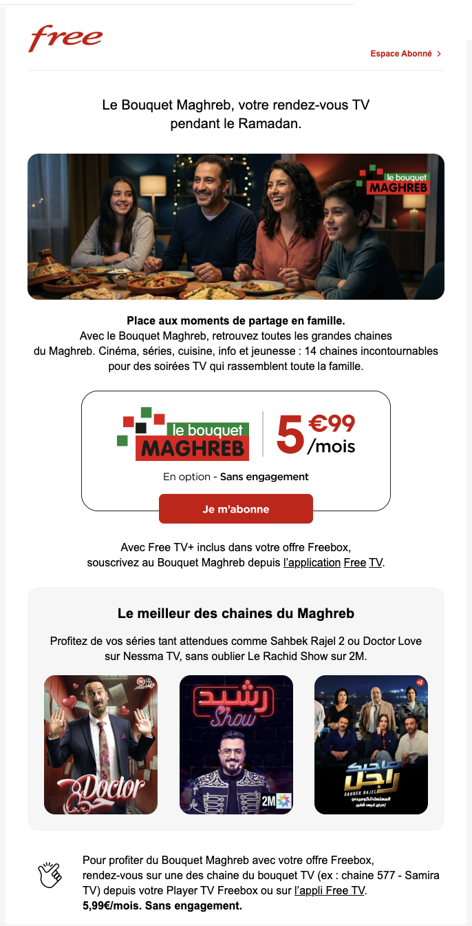 Pendant le Ramadan, Free met en avant l’un de ses bouquets internationaux les plus emblématiques auprès des abonnés Freebox. Dans un mail promotionnel actuellement envoyé à certains clients, l’opérateur rappelle qu’il est possible d’accéder « au meilleur des chaînes du Maghreb » directement depuis son Player TV ou l’application Free TV, grâce à une offre dédiée regroupant plusieurs grandes chaînes généralistes et thématiques.