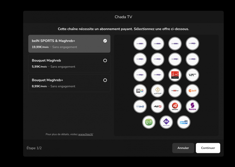 Dans les faits, ce bouquet est accessible en option depuis les Freebox via les chaînes dédiées, par exemple la chaîne 577 pour Samira TV, mais aussi directement depuis l’interface Free TV+. Lorsqu’un abonné tente d’accéder à une chaîne comme Chada TV sans abonnement, une fenêtre propose immédiatement la souscription au Bouquet Maghreb à 5,99 €/mois, ou à des formules plus complètes comme Maghreb+ à 8,99 €/mois (21 chaînes) ou l’offre combinée beIN Sports & Maghreb+ à 19,99 €/mois.